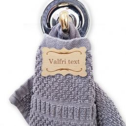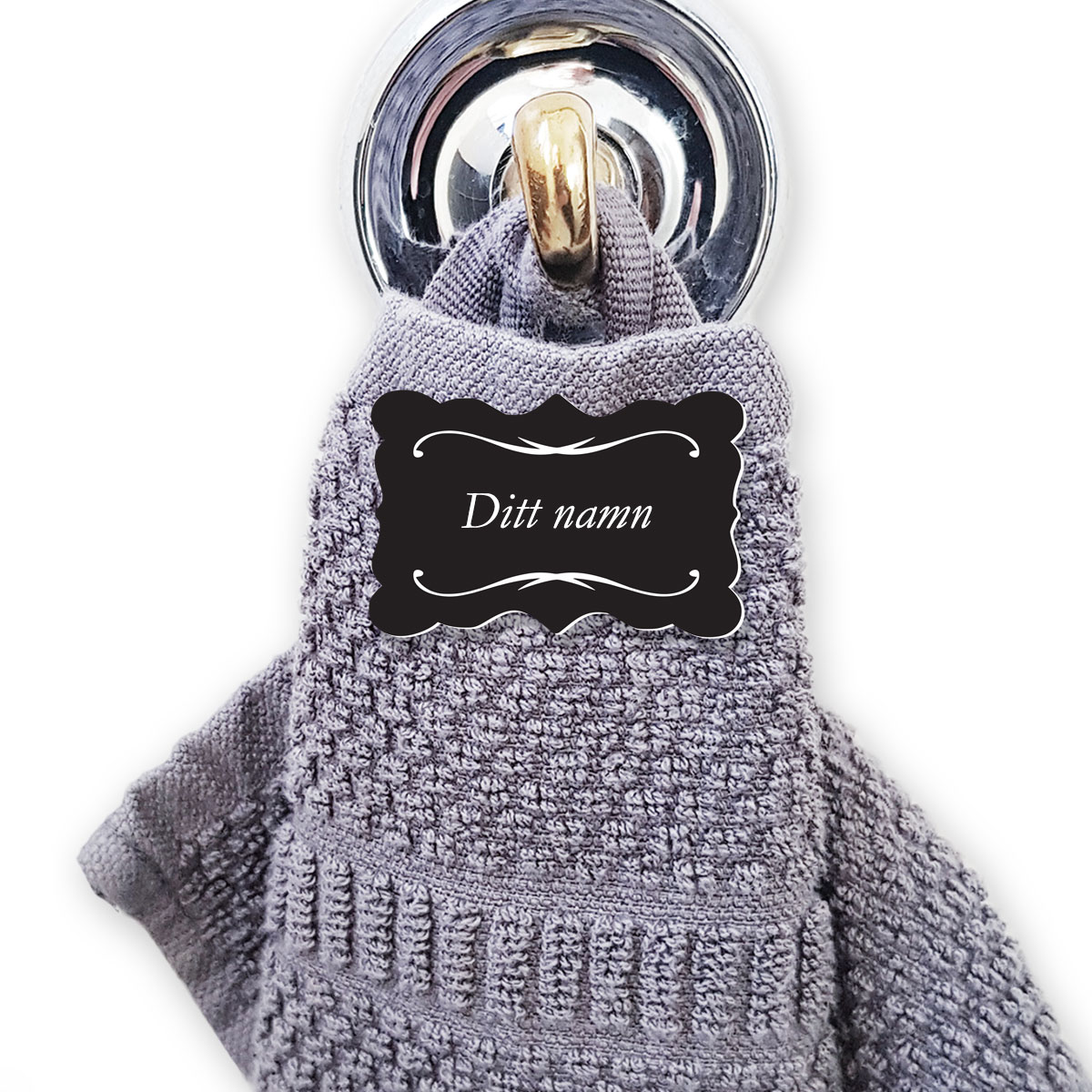 Skylten monterar du fast direkt på handduken med ett smart magnetsystem. Den är sitter stadigt och är enkel att sätta fast och ta bort när du ska tvätta handduken. Du väljer vilket typsnitt texten ska ha samt vilken ord eller namn som ska graveras in.