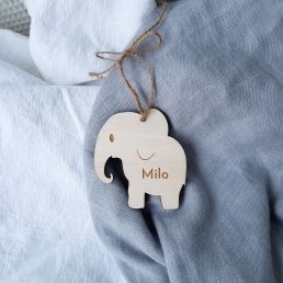 Liten, hängande elefant i trä med med valfri, graverad text. 1rad med 10 tecken får plats på skylten.