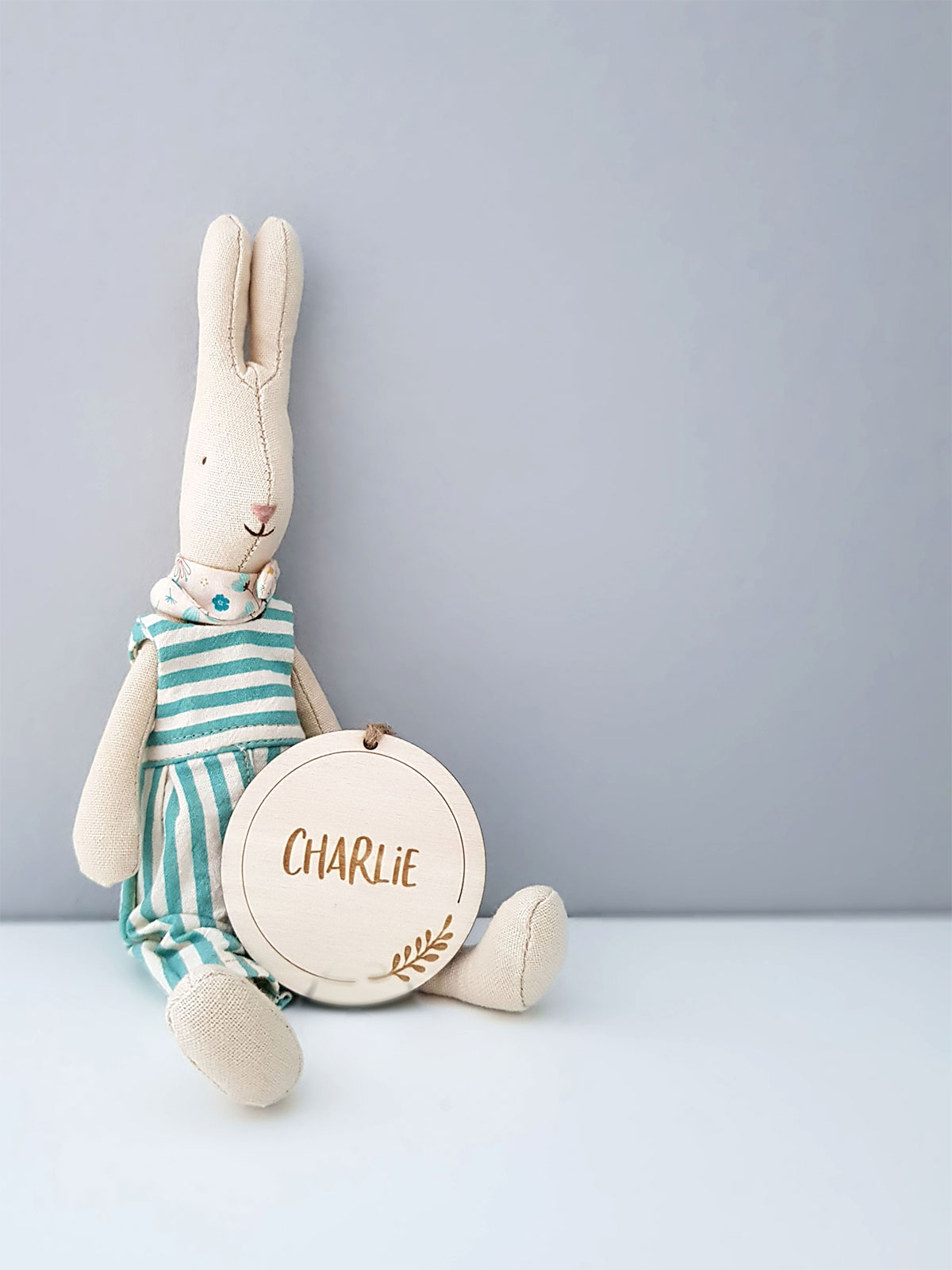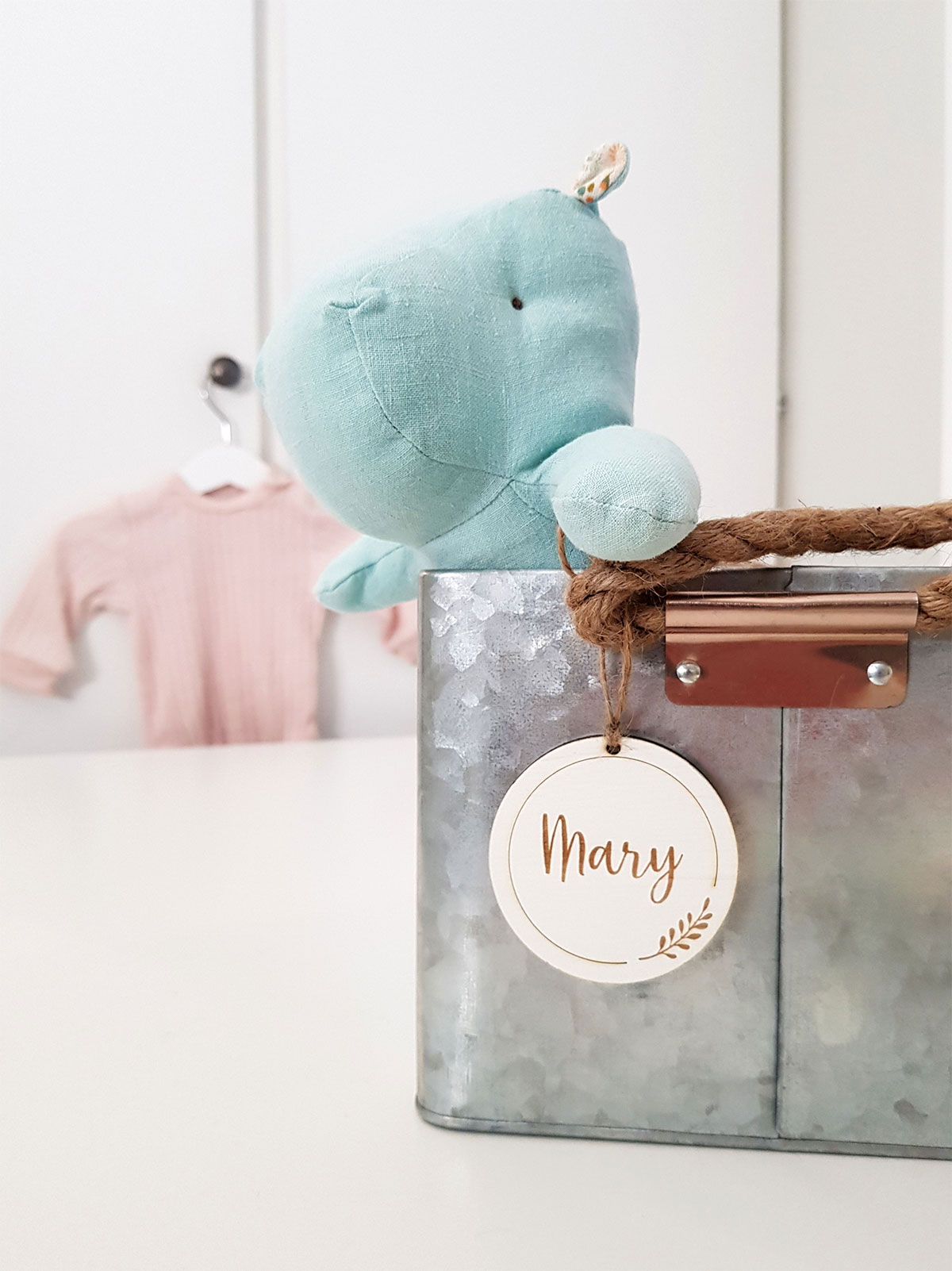 Skylten är tillverkad i träfaner och levereras med ett hänge i jutetråd. Du kan beställa namnskylten i följande färger: vitt, rosa, blått, grönt, grått och natur. Alla färgerna är vattenlösliga och målas på skylten för hand. Namnet eller orden graveras in i skylten. Själva gravyren får en nötbrun nyans som varierar i styrka beroende på hur träytan ser ut.
