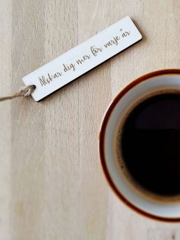 Hängande namnskylt i trä med valfri, graverad text. Max 30 tecken får plats på skylten. Passar som inredningsdetalj i det egna hemmet eller som en extra fin namnetikett till paket och julklappar.