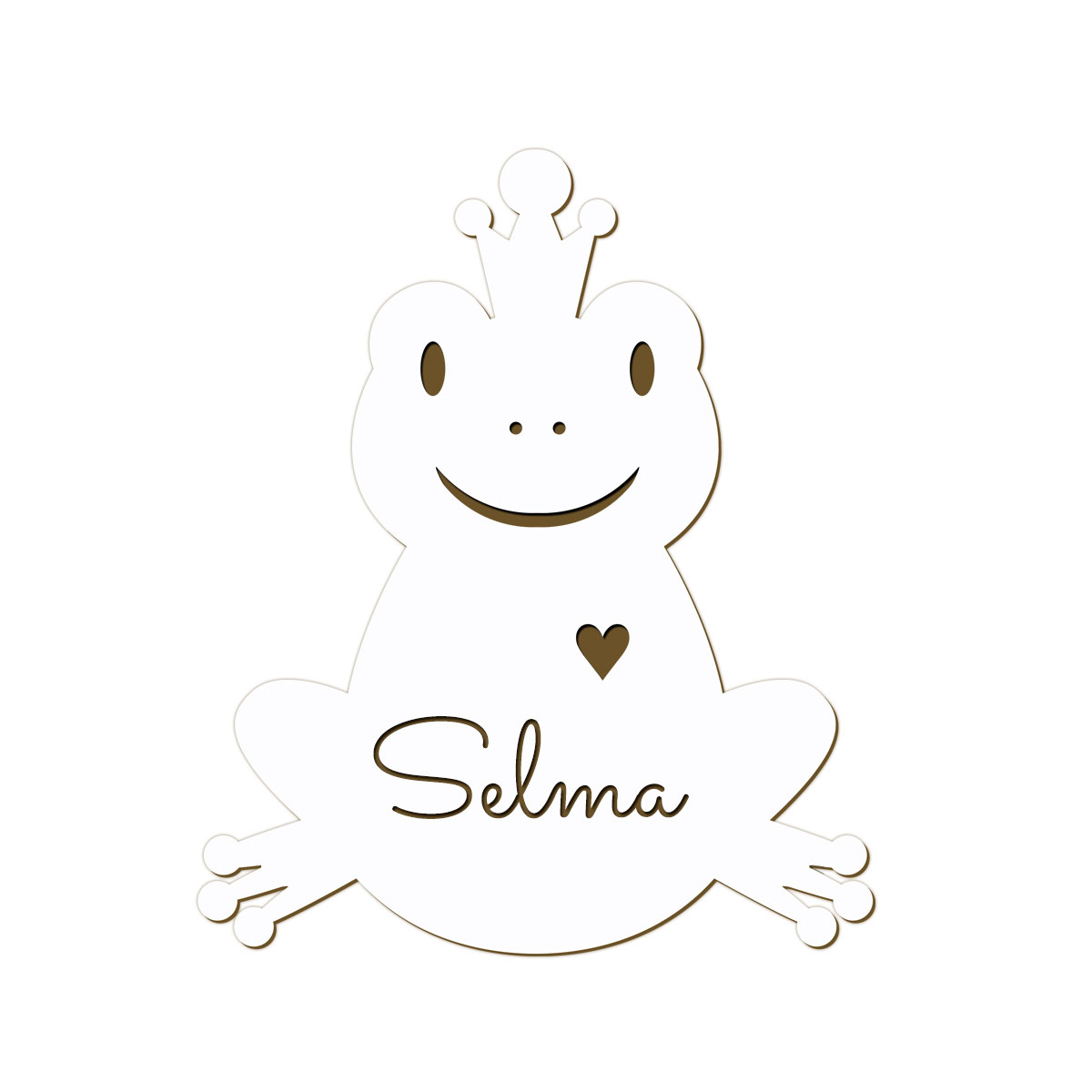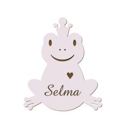 Rar groda i trä med snälla ögon, glad mun, bultande hjärta och en liten krona. Söt skylt till barnrummet med valfri namngravyr. Namnskylten tillverkar vi i handmålat träfaner, där detaljerna samt barnnamnet graveras in. Gravyren får en fin nötbrun nyans som variera beroende på träets karaktär. Det innebär att alla skyltar får ett unikt utseende.