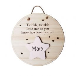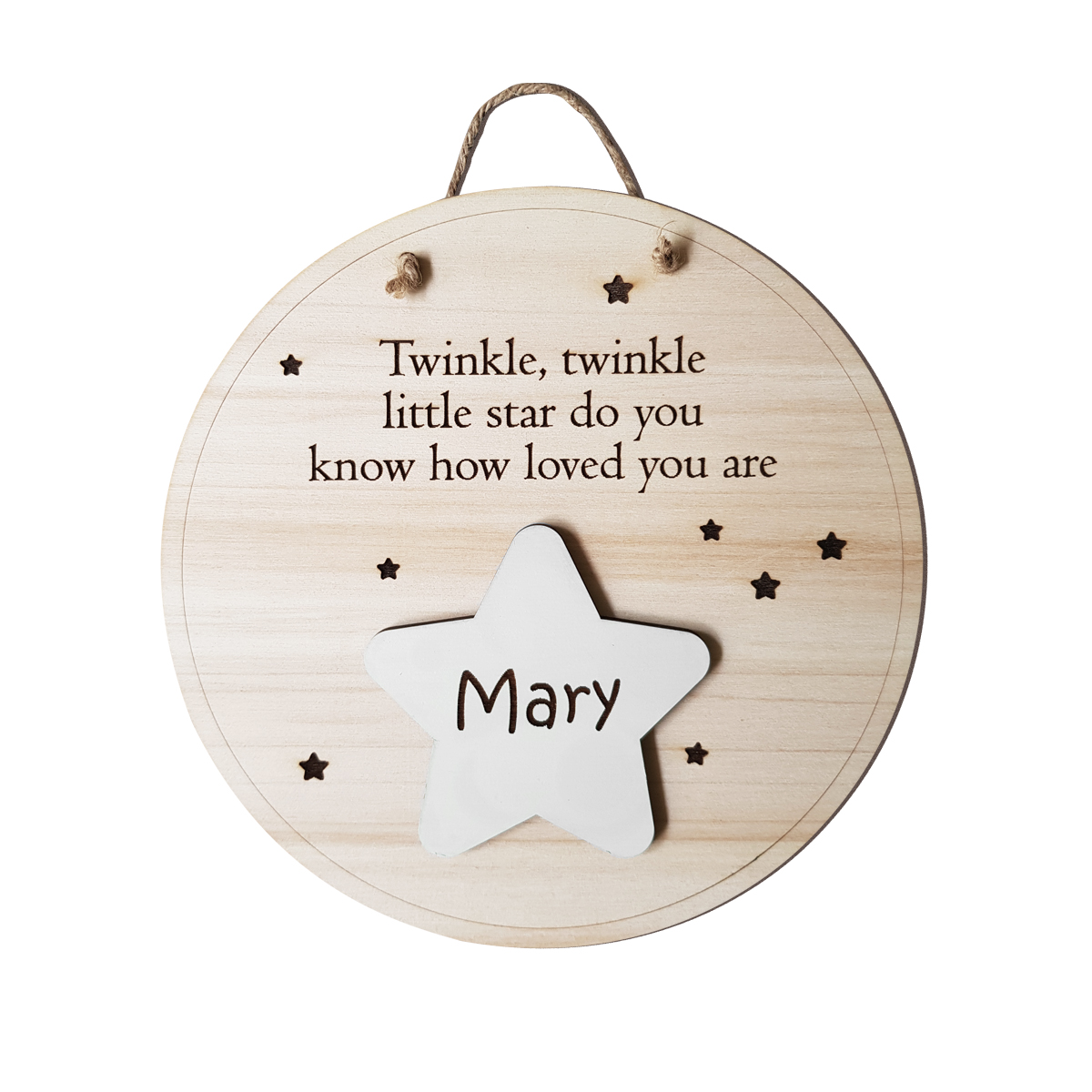 Rund, träfärgad namntavla med ramsa på engelska och en bullig stjärna i valfri färg som vi graverar in barnets namn på. Stjärnan är lite högre än resten av tavlan, vilket ger den en fin 3D-känsla. Rimmet som står på tavlan är “Twinkle, twinkle little star do you know how loved you are”.