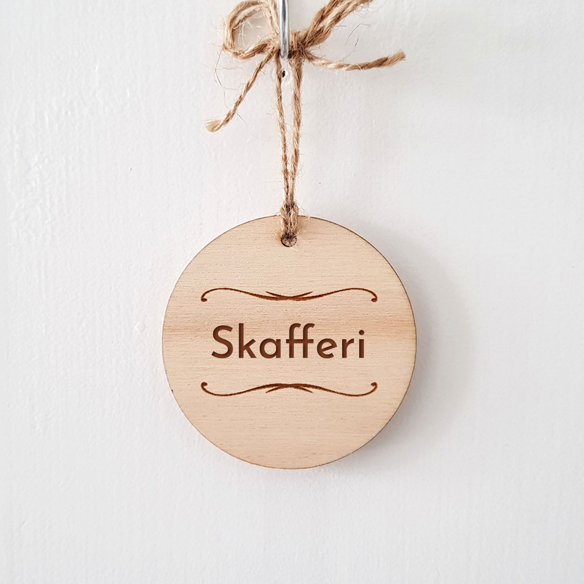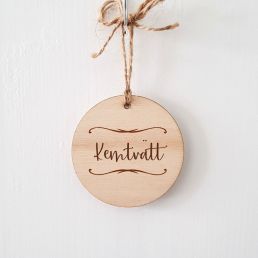 Rund namnskylt i trä med fina graverade detaljer. En personlig liten skylt med valfri text på en rad. Passar som inredningsdetalj i det egna hemmet eller som present till t ex födelsedag och student.